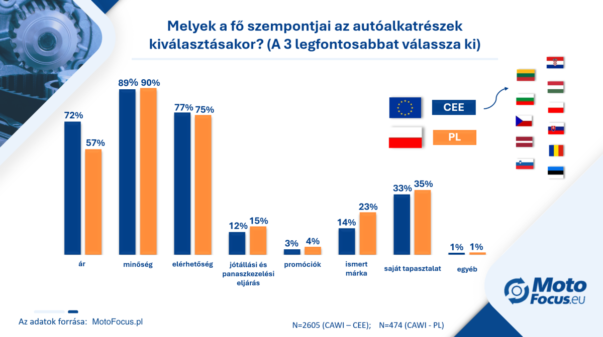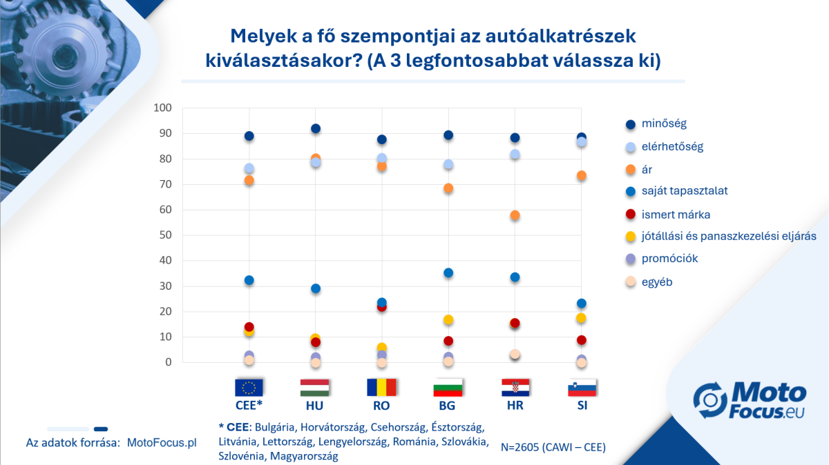 A vizsgált összes országban az alkatrészek minősége áll az első helyen a kiválasztási kritériumok hierarchiájában. A javítóműhelyek számára ez kulcsfontosságú elem mind a javítás biztonsága, mind a végfelhasználóval szembeni felelősség szempontjából. Fontos, hogy a minőség előnye más kritériumokkal szemben egyértelmű és stabil – függetlenül a helyi utángyártott piac fejlettségi szintjétől.