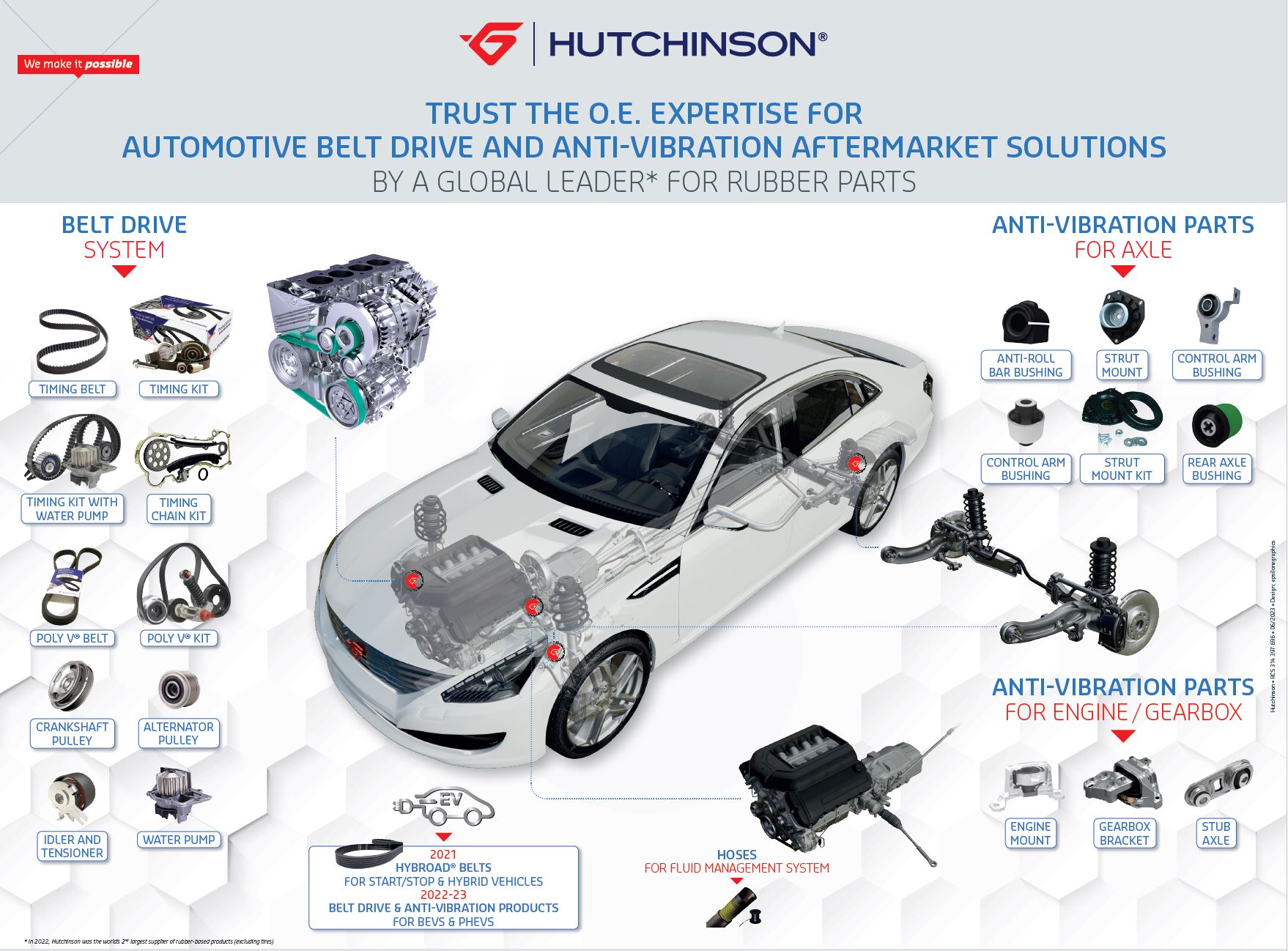 A forgalmazók, szerelők és ügyfelek körülbelül 8000 eredeti alkatrész minőségű, Hutchinson piros logóval ellátott alkatrészhez férhetnek hozzá az utángyártott piacon. A termékpaletta személygépkocsik, könnyű haszongépjárművek és nehézgépjárművek referenciáit tartalmazza, beleértve: